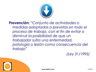El documento presenta una introducción a la prevención de riesgos laborales en España. Define conceptos clave como prevención, salud y riesgo. Explica cómo se manifiesta el riesgo a través de accidentes de trabajo y enfermedades profesionales. Detalla las obligaciones de empresarios y trabajadores, y los organismos e instrumentos de prevención como la evaluación de riesgos y el comité de seguridad y salud.