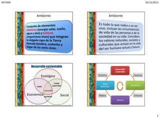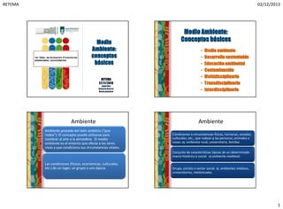 Este documento presenta conceptos básicos sobre el medio ambiente. Explica que el medio ambiente se refiere al entorno que rodea a los seres vivos y condiciona su existencia. Luego define el desarrollo sustentable como aquel que satisface las necesidades del presente sin comprometer las generaciones futuras, abarcando dimensiones ecológicas, sociales y económicas. Finalmente, introduce brevemente la contaminación, la educación ambiental y las diferencias entre enfoques multidisciplinarios, transdisciplinarios e interdisciplinarios para estud