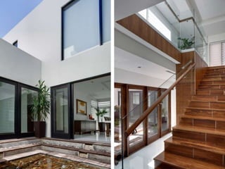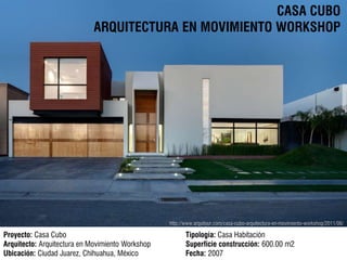El documento describe el proyecto arquitectónico de la Casa Cubo en Ciudad Juárez, México. El diseño conceptual se basa en cuatro elementos naturales - agua, fuego, aire y tierra - representados por patios internos. La casa está compuesta por volúmenes funcionales en lugar de plantas, conectados visualmente por los patios. La fachada principal enfatiza el acceso con un gran volumen suelto, mientras que los demás volúmenes se organizan armónicamente entre la luz natural y el paisaje.