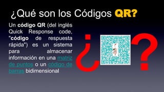 Los códigos QR son una evolución de los códigos de barras tradicionales que permiten almacenar grandes cantidades de datos en una matriz bidimensional. Pueden usarse para incluir enlaces web, archivos adjuntos, videos y otros contenidos en folletos, carteles y otras publicaciones impresas. Para crear un código QR, se elige un generador en línea, se ingresa el texto y se genera la matriz de puntos correspondiente.