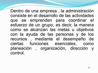 El documento habla sobre la administración dentro de una empresa. Explica que la administración consiste en coordinar el esfuerzo de un grupo para alcanzar las metas u objetivos de la empresa mediante funciones como la planeación, organización, dirección y control. También describe los procesos administrativos, las diferentes áreas funcionales de una empresa y algunos conceptos relacionados con la administración empresarial.