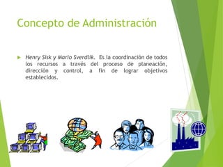 La administración es el proceso de coordinar los recursos de un grupo social de manera eficaz y eficiente para lograr sus objetivos con la máxima productividad. Incluye funciones como la planeación, organización, dirección, integración de personal y control. Es universal y aplicable a cualquier tipo de organización formal. Su flexibilidad permite adaptarse a las necesidades específicas de cada grupo, y es importante porque simplifica el trabajo y aumenta la productividad y eficiencia de las organizaciones.