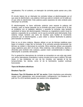 Los breakers eléctricos y los tableros eléctricos son dispositivos esenciales para la seguridad en las instalaciones eléctricas. Los breakers interrumpen el flujo eléctrico cuando la corriente es demasiado alta para prevenir incendios, mientras que los tableros eléctricos contienen los breakers y otros mecanismos para distribuir y controlar la electricidad de manera segura en una construcción. Existen diferentes tipos de breakers y tableros eléctricos diseñados para cumplir con
