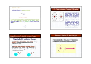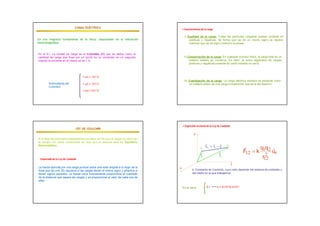La carga eléctrica es una propiedad fundamental responsable de la interacción electromagnética. Se mide en coulombs y siempre se presenta en múltiplos enteros de la carga del electrón. La Ley de Coulomb establece que las cargas ejercen fuerzas atractivas o repulsivas dependiendo de su signo, variando inversamente con el cuadrado de la distancia. La Ley de Gauss relaciona el flujo del campo eléctrico a través de una superficie cerrada con la carga neta encerrada.