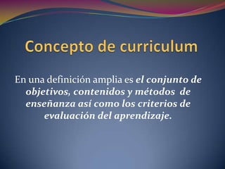 El documento define el concepto de currículo como el conjunto de objetivos, contenidos, métodos de enseñanza y criterios de evaluación. Explica que existen cuatro fuentes principales del currículo: los enfoques progresistas centrados en el niño, los esencialistas enfocados en la estructura de contenidos, los sociólogos que destacan las necesidades socio-culturales, y la experiencia pedagógica que aspira a mejorar la enseñanza.