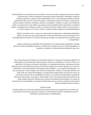 El diseño gráfico es una profesión que crea comunicaciones visuales para transmitir mensajes a grupos sociales. Incluye el diseño publicitario, editorial, de identidad corporativa, web, envases, tipografía, carteles y señalización. Aunque las herramientas digitales ahora asisten gran parte del trabajo, los conceptos fundamentales de la comunicación humana siguen siendo los mismos. El diseño gráfico es importante para mostrar ideas, hechos y valores de manera visual.