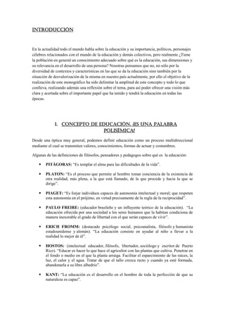 Este documento proporciona una introducción al concepto de educación y explora sus diferentes dimensiones. Define la educación como un proceso de socialización y endoculturación a través del cual se desarrollan capacidades, habilidades y formas de comportamiento. Examina las características de una persona educada según la LOE española y discute la desigualdad de género en el acceso a la educación. Finalmente, analiza las dimensiones morales, sociales y económicas de la educación.
