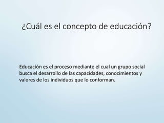 La educación es el proceso mediante el cual un grupo social busca desarrollar las capacidades, conocimientos y valores de sus individuos. La educación depende del grupo social y sus agentes externos e internos, y se enfoca en enseñar habilidades, valores y conocimiento a través del ejemplo y la práctica para permitir la convivencia entre los individuos del grupo.