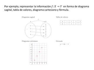 Este documento describe diferentes formas de representar funciones, incluyendo expresiones verbales, algebraicas, tablas de valores y gráficas. Explica cómo elaborar tablas de valores y bosquejar gráficas de funciones, así como un método gráfico para identificar si una gráfica representa una función verdadera mediante el trazado de líneas verticales. Proporciona ejemplos ilustrativos de estas técnicas.