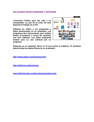 El hardware se define como el conjunto de componentes físicos de una computadora, en contraste con el software, que se refiere a los componentes lógicos. Se clasifica en hardware básico y complementario, incluyendo periféricos de entrada, salida y de entrada/salida, así como la CPU y RAM. Su desarrollo ha progresado a través de diversas generaciones, desde tubos de vacío hasta microprocesadores, y se espera que la nanotecnología impulse aún más su evolución.