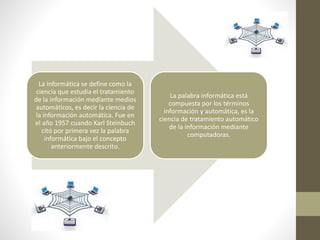 La informática estudia el tratamiento automático de la información mediante computadoras. Se define como la ciencia de la información automática y surgió en 1957. El derecho a la informática regula las acciones jurídicas relacionadas con la informática y sus aplicaciones. La inteligencia artificial es el estudio del comportamiento inteligente humano a través de modelos computacionales y nació en 1943 con la prueba de Turing.