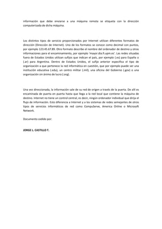 Internet es una red mundial de redes informáticas interconectadas que permite a computadoras compartir información. Está formada por redes locales conectadas entre sí a través de servidores especiales llamados puertas. La información se transmite entre puertas hasta llegar a la red local de destino, sin un control central. Permite a computadoras de todo el mundo comunicarse y compartir recursos.
