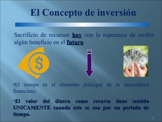 Este documento discute el concepto de inversión. Explica que una inversión implica sacrificar recursos hoy con la esperanza de recibir algún beneficio en el futuro. También señala que al evaluar una inversión es importante considerar no solo los recursos monetarios sino también otros recursos valiosos y escasos. Además, existe el riesgo de que la inversión no genere los beneficios esperados.