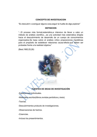 Este documento define la investigación como un proceso sistemático de análisis científico dirigido al descubrimiento y desarrollo de conocimiento. Explora las fuentes de ideas de investigación, incluyendo experiencias, material escrito, teorías y observaciones. También discute que las ideas iniciales a menudo son vagas y requieren análisis para transformarlas en planteamientos más precisos. En resumen, la investigación se origina en ideas que pueden provenir de varias fuentes, y esas ideas necesitan ser analizadas y definidas con más clar
