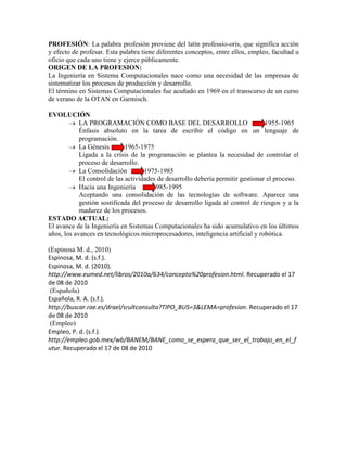 El documento describe el origen y evolución de la profesión de Ingeniería en Sistemas Computacionales. Explica que surgió de la necesidad de las empresas de sistematizar procesos de producción y desarrollo utilizando computadoras. Se divide su evolución en etapas iniciales de programación, luego enfocándose en controlar el proceso de desarrollo, y más recientemente adoptando una ingeniería más robusta ligada al control de riesgos. Finalmente, menciona que recientemente ha avanzado gracias a mejoras en micropro