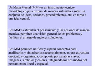 Un mapa mental (MM) es una herramienta para organizar ideas de manera sistemática en torno a una idea central. Los MM estimulan el pensamiento creativo al permitir una visión general de los problemas y facilitar mejores soluciones mediante palabras clave, imágenes, símbolos y colores. La creación de un MM implica definir el centro, organizar ideas secuencialmente en torno a él, y agrupar y asociar conceptos a diferentes niveles.