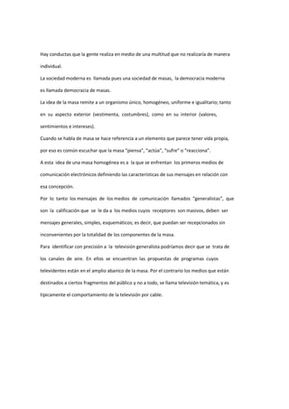 Este documento define el concepto de masa y su relación con los medios de comunicación masivos. Explica que la masa se refiere a un gran grupo de personas que comparten características homogéneas y conductas colectivas. Surge en la revolución industrial cuando millones de personas pasan a formar parte de la vida económica, social y política. Los primeros medios masivos se dirigían a esta masa homogénea con mensajes sencillos y esquemáticos. La televisión generalista transmite a la amplia masa, mientras la tele