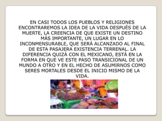 Este documento describe las diferentes perspectivas y celebraciones de la muerte en las culturas prehispánicas mexicanas y en la actualidad. En la cultura náhuatl precolombina, la muerte era adorada como un dios y controlaba el destino del universo. El noveno mes del calendario azteca estaba dedicado a los pequeños difuntos y el siguiente a los adultos fallecidos. Después de la conquista, la Iglesia Católica estableció el 1 de noviembre para los niños y el 2 de novi