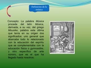 La música se deriva de las palabras griegas "mousike" y latina "musica", que originalmente se referían a la educación del espíritu y el cuerpo. Aristóteles definió la música como el arte que organiza los sonidos en el tiempo mediante notas con tono y duración. La música latinoamericana engloba diversos ritmos y géneros de América Latina y el Caribe como la salsa, la cumbia, el tango y el bolero.