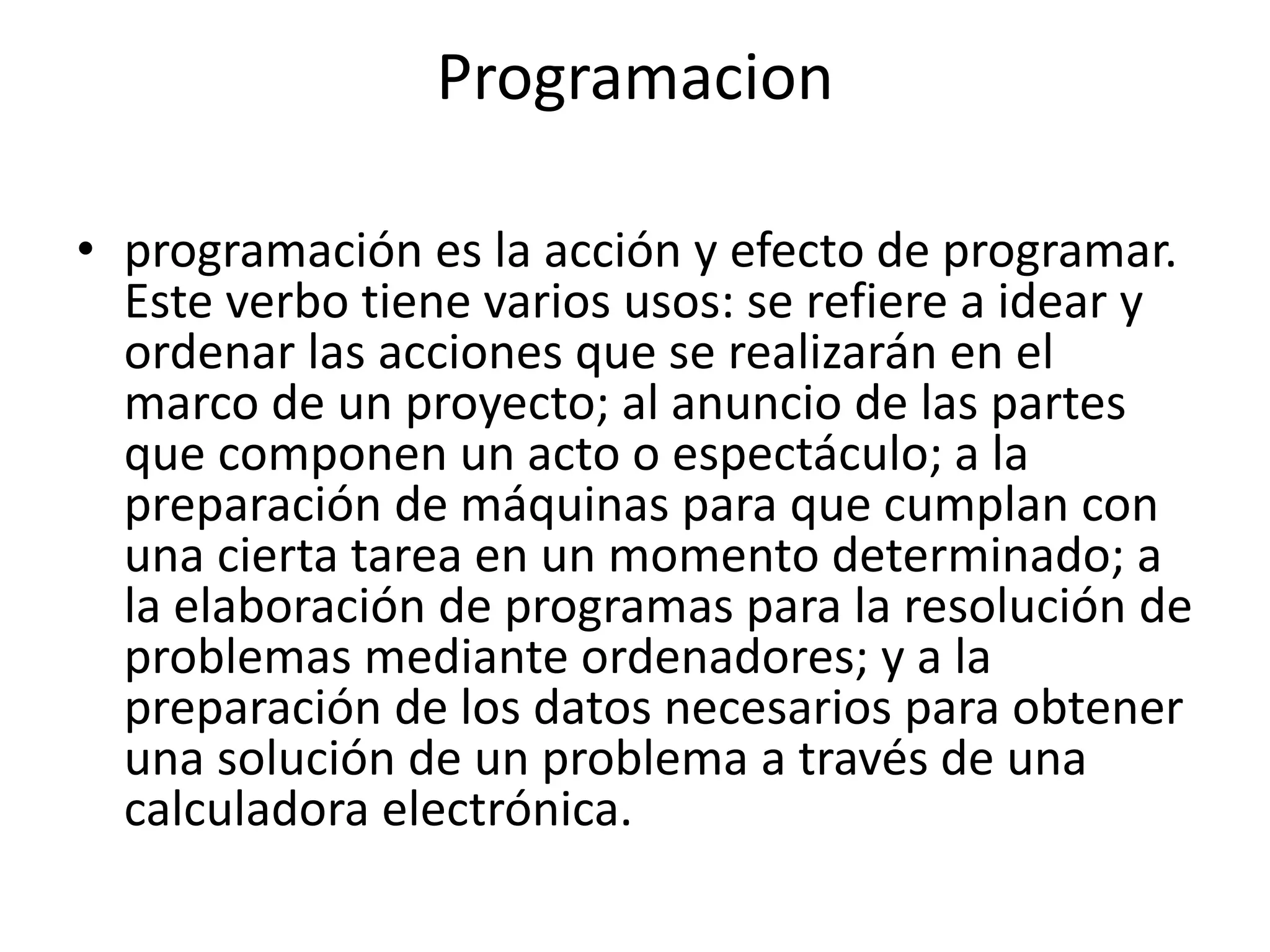 Este documento trata sobre conceptos básicos de programación. Explica que la programación se refiere a planificar acciones para un proyecto o preparar máquinas para realizar tareas. También describe la programación estructurada, un paradigma que mejora la calidad y desarrollo de programas utilizando solo subrutinas, secuencia, selección e iteración. Finalmente, menciona algunas formas de representar algoritmos como diagramas de flujo, diagramas rectangulares y pseudocódigo.