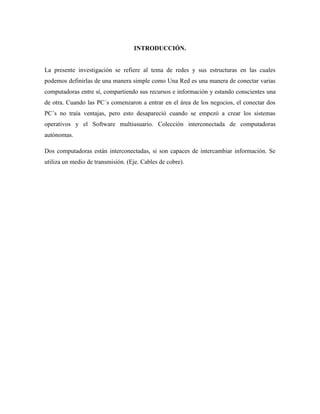 Este documento describe las características básicas de las redes de computadoras. Explica que una red permite conectar varias computadoras para compartir información y recursos. Describe los componentes clave de una red como las computadoras, el medio de transmisión como cables y las tarjetas de red. También explica diferentes tipos de medios de transmisión como pares trenzados, cable coaxial y fibra óptica. Por último, menciona algunas aplicaciones comunes de las redes como el correo electrónico y el acceso remoto a programas