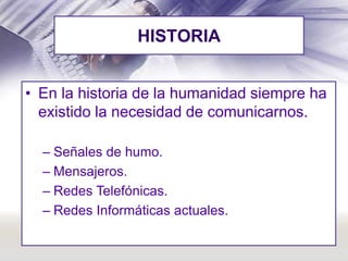 Este documento describe los conceptos básicos de las redes, incluyendo su historia, definición en informática, razones para usarlas y elementos comunes. Explica las clasificaciones de redes por alcance, tipo de conexión, topología física, grado de autentificación, grado de difusión y servicio u función. Las redes se definen como conjuntos de elementos unidos mediante algún medio para compartir información y recursos de forma más eficiente.