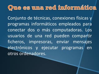 Este documento describe los diferentes tipos de redes informáticas, incluyendo las conexiones físicas y lógicas, la topología de red en bus, estrella, anillo y árbol, las redes inalámbricas Wi-Fi, las redes celulares, y los diferentes tipos de servidores como servidores de aplicaciones, bases de datos, audio/video y más. También explica los componentes necesarios para montar una red, como adaptadores de red, concentradores, componentes de hardware y software, y que dependen de la topología elegida.