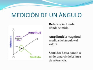 El documento describe la medición y notación de ángulos, rumbo y azimut. Define el rumbo como un ángulo agudo medido desde el norte o sur hacia la derecha u izquierda, con valores entre 0 y 90 grados. El azimut se mide desde el norte en sentido de las manecillas del reloj y puede variar entre 0 y 360 grados. Explica la relación entre rumbo y azimut en los cuatro cuadrantes definidos desde el norte.