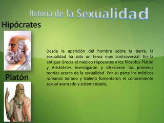 La historia de la sexualidad ha sido explorada desde la antigüedad, con figuras como Hipócrates, Platón y Aristóteles sentando las bases teóricas. En el siglo XIX, surgió el término 'sexualidad' debido a debates sobre diversos temas sociales, y Iwan Bloch fue fundamental en la modernización de la sexología. Tras la Segunda Guerra Mundial, la sexología revivió en EE. UU. gracias a los informes de Kinsey y los estudios de Masters y Johnson, que establecieron la base de la terapia sexual contemporánea.