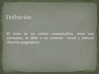 El texto es un evento comunicativo con estructura que depende del contexto social y cultural. Según de Beaugrande y Dressler, las normas de textualidad incluyen la cohesión, coherencia, intencionalidad, aceptabilidad, informatividad, situacionalidad e intertextualidad. Según Teun A. van Dijk, las dimensiones del texto son notacional, morfológica, sintáctica, semántica y pragmática, y los niveles son superestructural, macroestructural, microestructural, estilístico y