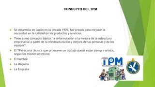 El documento presenta el concepto de Mantenimiento Productivo Total (TPM), que se originó en Japón en los años 70 para mejorar la calidad de productos y servicios mediante la reestructuración de personas y equipos. Se detalla su estructura en ocho pilares, que incluyen mantenimiento preventivo, capacitación, y control administrativo, y se discuten sus objetivos como la reducción de pérdidas y la mejora de resultados empresariales. Además, se menciona el proceso de implantación del TPM, que abarca varias fases y puede tardar entre 3 meses y 3 años.