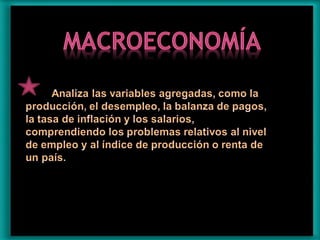 La economía estudia el comportamiento de los individuos en la producción, intercambio, distribución y consumo de bienes y servicios. Los gobiernos adoptan políticas económicas y apoyan a las empresas para fomentar la creación de empleos y producción, optimizando los recursos disponibles. La economía examina cómo las sociedades utilizan sus recursos limitados para satisfacer las necesidades de sus miembros.