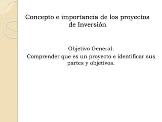 El documento describe los pasos clave en la formulación y evaluación de proyectos de inversión. Explica que un proyecto es un plan para producir un bien o servicio que resuelva una necesidad humana de manera eficiente y rentable. Detalla las partes principales de la evaluación, incluyendo el estudio de mercado, el estudio técnico, el estudio económico y el análisis de riesgo. El objetivo es determinar si el proyecto es viable y rentable antes de tomar la decisión de inversión.