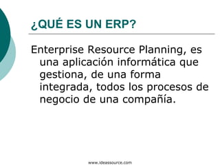 Un ERP es una aplicación informática que gestiona de forma integrada todos los procesos de negocio de una compañía. SAP es un sistema ERP líder que consiste en módulos integrados para funciones como finanzas, ventas, recursos humanos, producción y mantenimiento. SAP utiliza una arquitectura cliente-servidor y es compatible con sistemas operativos como Windows y UNIX y bases de datos como Oracle y Sybase.