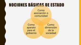 El documento presenta las nociones básicas del concepto de Estado. Define al Estado como una asociación o comunidad, como una dimensión de la sociedad, y como un aparato para el gobierno. Explica las teorías del contrato social de Hobbes, Locke y Rousseau, y la teoría de Max Weber sobre el Estado moderno y su monopolio de la violencia legítima. Finalmente, analiza al Estado como una institución concreta que interviene en la sociedad de manera autónoma a través de la legislación, el sistema penal y la cultura.