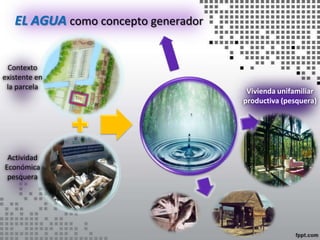 Este documento presenta un proyecto arquitectónico para una vivienda unifamiliar y productiva en Barcelona, Venezuela. La propuesta se centra en utilizar el agua como concepto generador para el diseño, aprovechando las oportunidades que ofrece el terreno y su contexto, incluyendo actividades pesqueras. El proyecto propone dividir el área en zonas residenciales y productivas, y usar el agua como elemento de comunicación, climatización y para modificar el entorno de una manera que fomente la convivencia entre la naturaleza