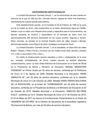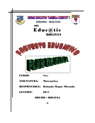Este documento presenta información sobre la Unidad Educativa "Carmela Cerruto" No 1 en Oruro, Bolivia. La escuela se fundó en 1956 y actualmente atiende a estudiantes de niveles inicial, primario y secundario. A lo largo de sus más de 50 años de servicio, la escuela ha recibido varias condecoraciones por su contribución a la educación. El documento también incluye un plan de aula para la asignatura de matemáticas en primer grado, con objetivos, contenidos, estrategias y evaluaciones.