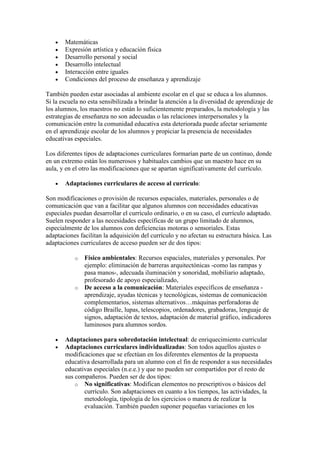 El documento define las necesidades educativas especiales (NEE) como las dificultades que presentan algunos alumnos para acceder al currículo escolar debido a discapacidades o trastornos. Explica que las NEE pueden requerir adaptaciones curriculares como modificaciones a los contenidos, objetivos o criterios de evaluación. Además, distingue entre adaptaciones curriculares de acceso, que facilitan el acceso al currículo sin afectar su estructura, e individualizadas o significativas, que implican cambios más profundos al curr