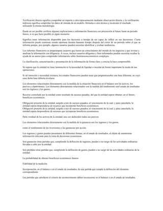 El documento proporciona información sobre los objetivos y principios de la información financiera. En resumen: 1) La información financiera debe ser útil para los inversores, prestamistas y otros usuarios para tomar decisiones sobre el suministro de recursos a la entidad; 2) Debe proporcionar información sobre los recursos económicos de la entidad y los derechos de los acreedores; 3) Los estados financieros deben presentarse de forma que sean útiles, relevantes, fiables y comparables.