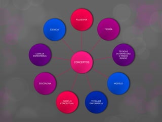 Este documento discute conceptos fundamentales en enfermería como filosofía, ciencia, disciplina, paradigma, modelo conceptual, teoría y teorías intermedias. Explica que la filosofía provee un marco para entender los fenómenos de enfermería, la ciencia genera conocimiento a través de la observación y razonamiento, y la disciplina se enfoca en un campo de estudio único. Además, describe paradigmas como formas de ver el mundo y modelos conceptuales como marcos de referencia para interpretar fenómenos. Finalmente, define te