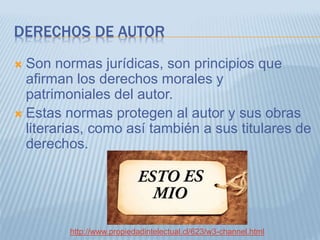 El documento trata sobre los conceptos de derechos de autor, copyright y propiedad intelectual. Explica que los derechos de autor son normas jurídicas que protegen los derechos morales y patrimoniales del autor sobre sus obras literarias. El copyright otorga al autor el derecho a decidir sobre la distribución y reproducción de su obra y obtener beneficios económicos. La propiedad intelectual se refiere a la protección de las creaciones del intelecto humano en distintas áreas como la literatura y las artes. También presenta line