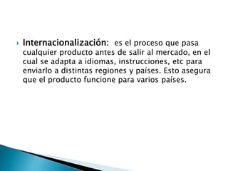 El documento presenta brevemente tres temas: la internacionalización como el proceso de adaptar un producto a diferentes idiomas e instrucciones para su distribución en varios países, Fernand Braudel como un historiador francés que revolucionó la historiografía del siglo XX al considerar factores económicos y geográficos, y South Bronx como un barrio específico del Bronx en Nueva York que a pesar de su nombre no incluye toda el área sur del distrito.