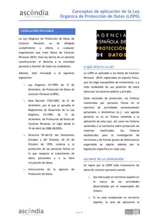 El documento habla sobre la Ley Orgánica de Protección de Datos (LOPD) en España. Explica que la LOPD establece normas para proteger los datos personales y obliga a todas las organizaciones a cumplir con estas normas. También describe los principios básicos de la protección de datos como la recopilación de datos para fines específicos y legítimos, así como los derechos de las personas sobre sus datos personales.