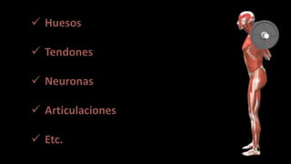 Este documento presenta conceptos clave sobre aptitud física, incluyendo definiciones de actividad física, ejercicio físico, deporte y metabolismo. Explica factores que afectan el gasto energético basal y total, y cómo se obtiene la energía a través de macronutrientes y micronutrientes. Luego describe los componentes de la aptitud física como composición corporal, capacidad aeróbica, fuerza muscular, resistencia muscular y flexibilidad. Incluye métodos para evaluar estos componentes a través de pruebas