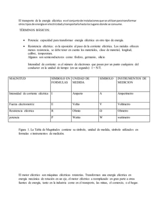 La electricidad se produce por el movimiento e interacción de cargas eléctricas positivas y negativas. Existen dos tipos de corriente eléctrica, continua y alterna. Los circuitos eléctricos pueden ser en serie, paralelo o mixtos. El transporte de energía eléctrica incluye instalaciones para transformar otras energías en electricidad y transmitirla a lugares de consumo.