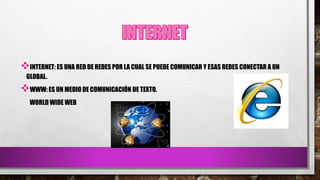 Este documento resume conceptos clave de Internet y la World Wide Web. Explica que Internet es una red de redes global que permite la comunicación a través de enlaces entre redes, y que la WWW es un medio de comunicación de texto a través de páginas web. También describe navegadores, buscadores, protocolos como HTTP, FTP y HTML, así como URLs, direcciones IP, blogs, foros, páginas web, servidores de sitios web y JavaScript.