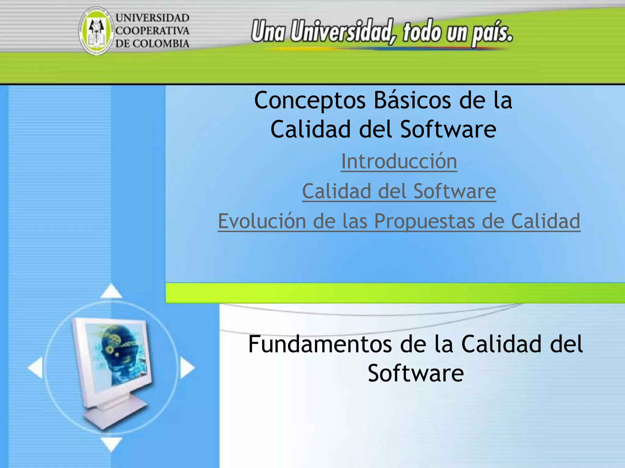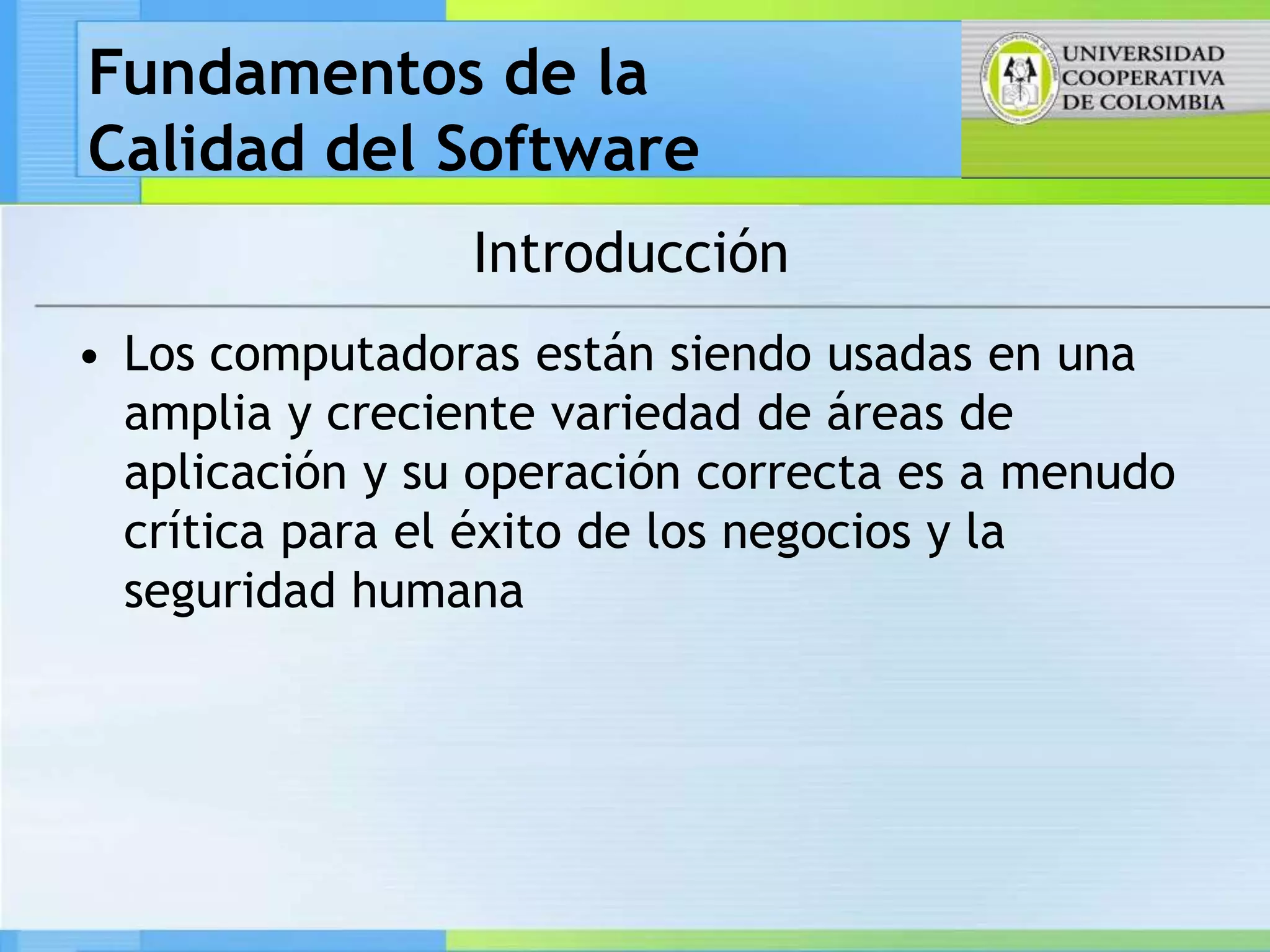 El documento introduce los conceptos básicos de la calidad del software, incluyendo su definición e importancia. Explica la evolución del pensamiento sobre la calidad del software a través de varias propuestas tempranas que categorizaron factores de calidad. Finalmente, discute cómo enfoques posteriores profundizaron la distinción entre atributos y requisitos de calidad.
