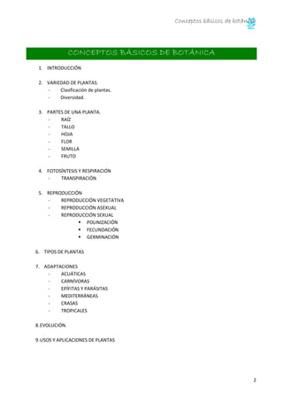 El documento presenta una introducción a los conceptos básicos de botánica. Explica las partes principales de las plantas incluyendo la raíz, tallo, hoja, flor, fruto y semilla. También describe la clasificación de plantas, la fotosíntesis, reproducción, tipos de plantas y sus adaptaciones. El documento provee una visión general de la estructura, función y diversidad de las plantas.