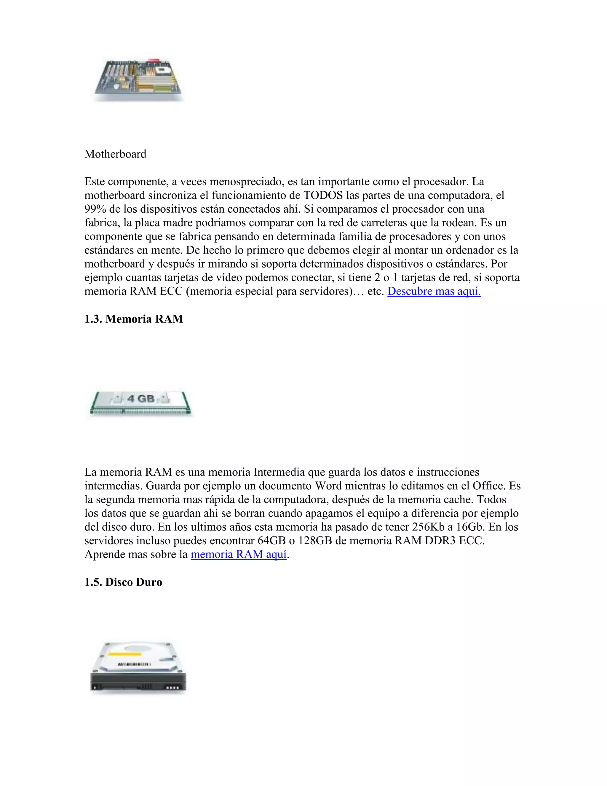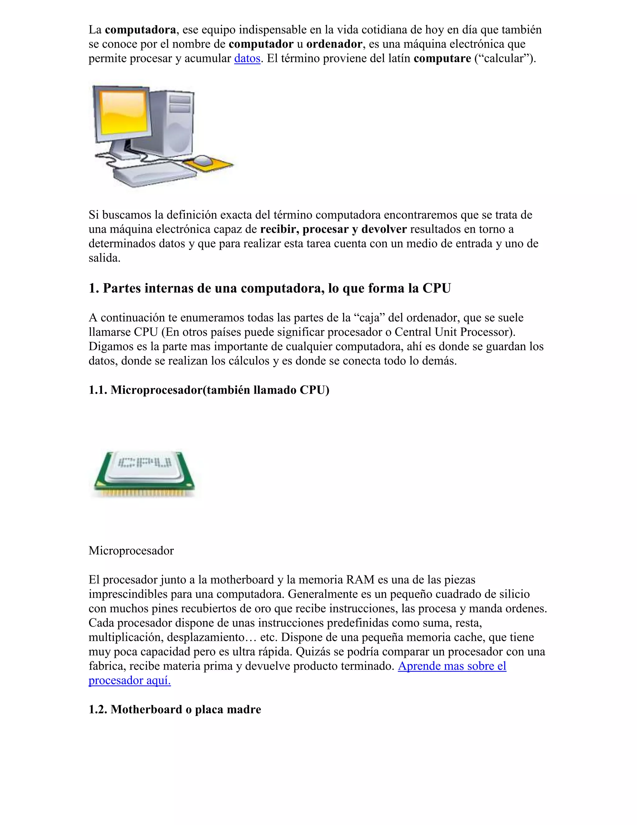 El documento describe la computadora como una máquina electrónica que procesa y almacena datos, mencionando sus componentes principales como el microprocesador, la placa madre, la memoria RAM y el disco duro. Además, clasifica el hardware en diferentes tipos, incluyendo el hardware indispensable y complementario, así como la distinción entre almacenamiento interno y externo. También se abordan las unidades de medida de información, desde bits hasta zettabytes.