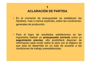 Este documento trata sobre los costos y presupuestos de construcción. Explica conceptos como tareas, rubros, subrubros y componentes constructivos, y cómo estos se usan para estimar costos. También cubre temas como rendimientos de mano de obra, materiales y equipos, y cómo se calculan los costos unitarios directos de los subrubros. El objetivo es proveer una guía para la estimación de costos y presupuestos de manera correcta.